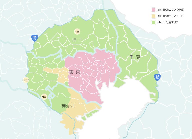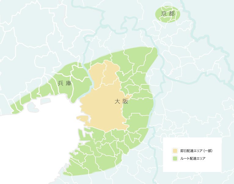 東京都、神奈川県、千葉県、埼玉県、大阪府、京都府、兵庫県の1都2府4県が配達可能エリアです。各一部エリアを除きます。