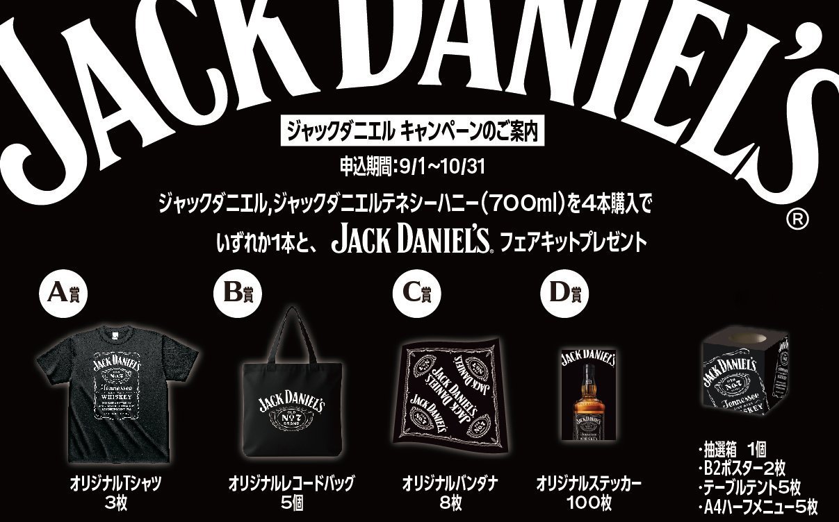 「ジャックダニエル ブラック」または「ジャックダニエル テネシーハニー」を合計4本以上ご注文につき、サンプルボトル1本と、「JACK DANILE'S フェアキット」A賞~D賞のいずれかをプレゼントいたします!