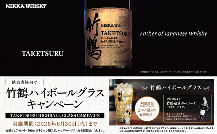 また、2023年の国際的ウイスキーコンテストで最高賞に輝くなど、品質とブランド力も折り紙付きです。さらに、飲食店様向けには「竹鶴ピュアモルト」はもちろん、「シングルモルト余市」「シングルモルト宮城峡」もすべて本数制限なくご提供可能です。飲み比べセットやシリーズ展開に活用することで、グラス・ボトル双方で安定した販売と継続的な売上創出につながります。日本のウイスキー市場でも注目されるNIKKA製品となります。ぜひ、貴店でのご採用をご検討お願い致します。