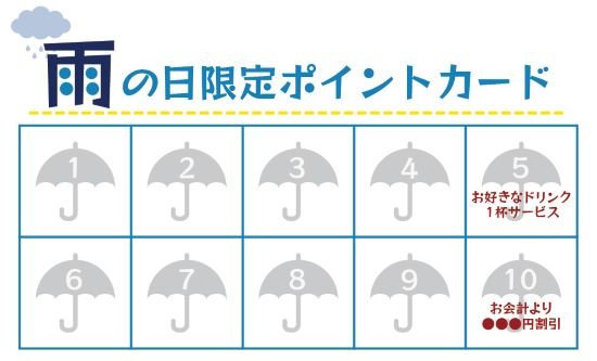 お店の立地条件によっては雨の日は客足がどうしても遠のいてしまいがちです。これからの梅雨に向けて、集客施策や来店してくださるお客様への御礼も込めて何かサービスをつくってはどうでしょうか。サービス内容は事前にSNSなどでしっかりと告知する事も大事です。
