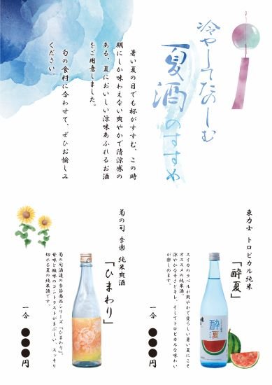 飲食店だからこそ出しやすいメニューの「季節感」。旬の食材だけでなく、ドリンクでも夏をイメージできるワインや日本酒をカクヤスでは多数扱っています。せっかく導入したドリンクを店内販促やSNSで周知してお店の雰囲気づくりに役立ててください。夏のアピールにぴったりなメニューを無料で作成致します。
