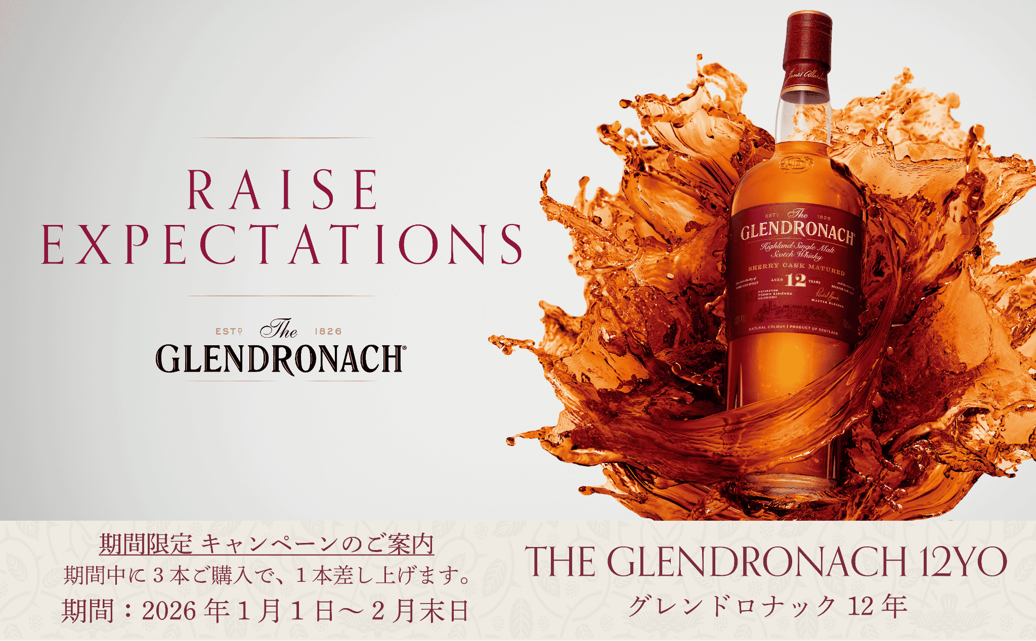 キャンペーン期間中に、シングルモルトウイスキー「グレンドロナック 12年」を3本ご購入で1本進呈いたします!